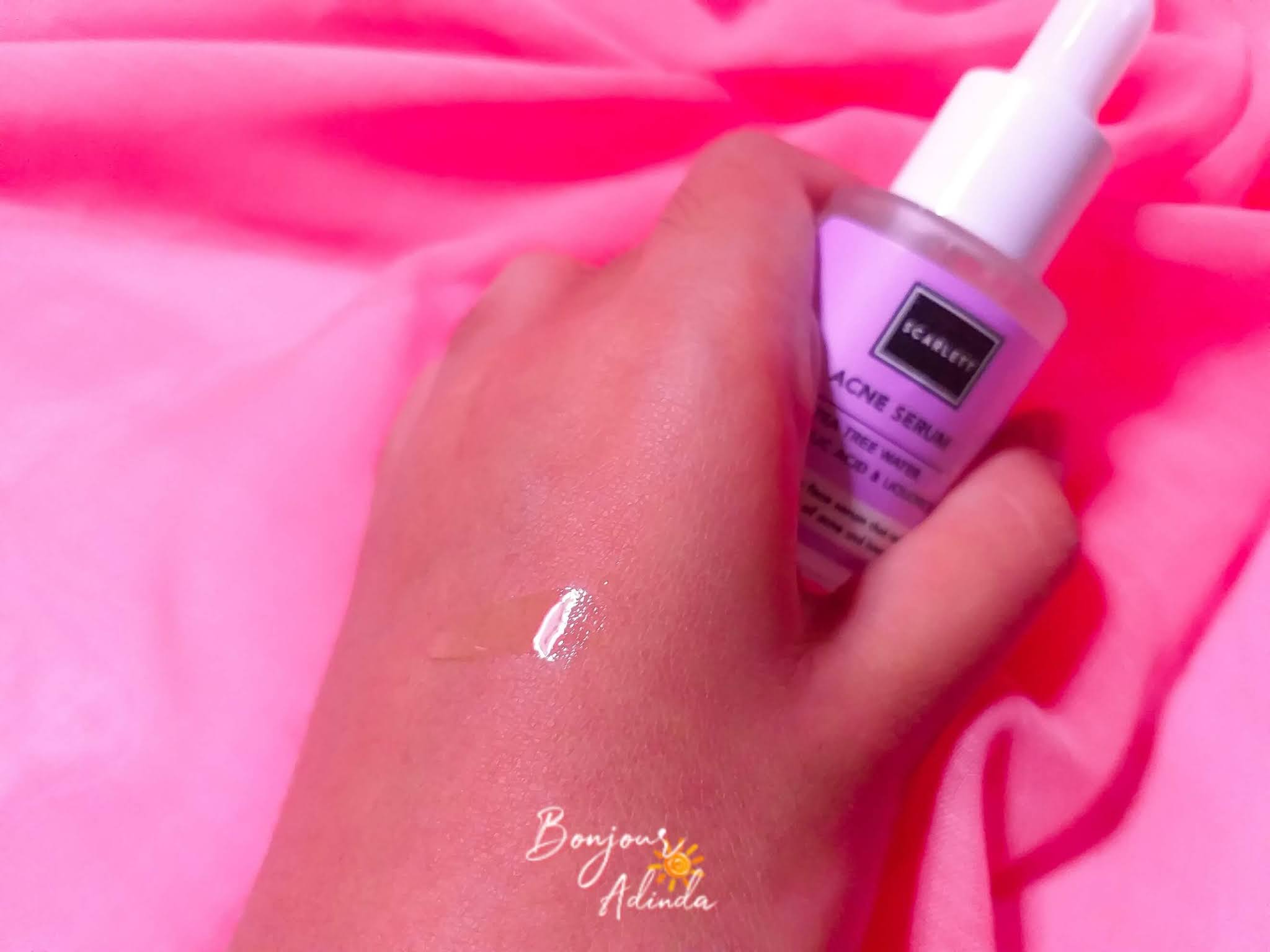Tekstur dari Acne Serum ini gak kental banget dan gak seberapa cair juga. Warnanya bening dan lebih clear kalau dibandingkan sama Brightly Ever After Serum. Baunya.. hmmm, aku juga bingung sih deskripsiinnya gimana Babys. Kayak antara ada dan gak ada, dan sebenernya juga dia gak mengandung fragarance juga jadinya mungkin ini baunya itu dari ingredients-nya. But, overall tidak mengganggu sama sekali.